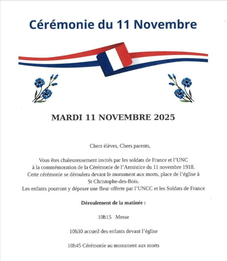 Les soldats de France et l'UNC organisent une commémoration de la Cérémonie de l'Armistice du 11 novembre, le mardi 11 novembre 2025, place de l'Église à St-Christophe des Bois.