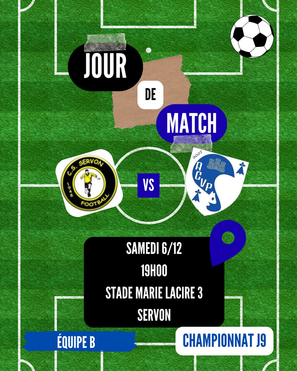 Match C.S. SERVON FOOTBALL vs ACVP, le samedi 6 décembre 2025 à 19h00, au stade Marie Lacire 3, à Servon sur Vilaine.