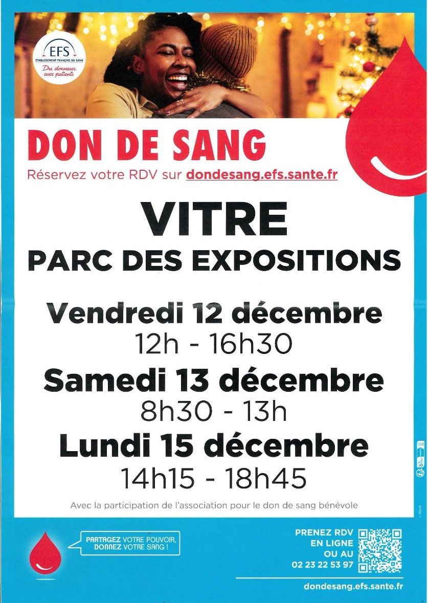 Don de sang au Parc des Expositions à Vitré, du vendredi 12 au lundi 15 décembre 2025.
