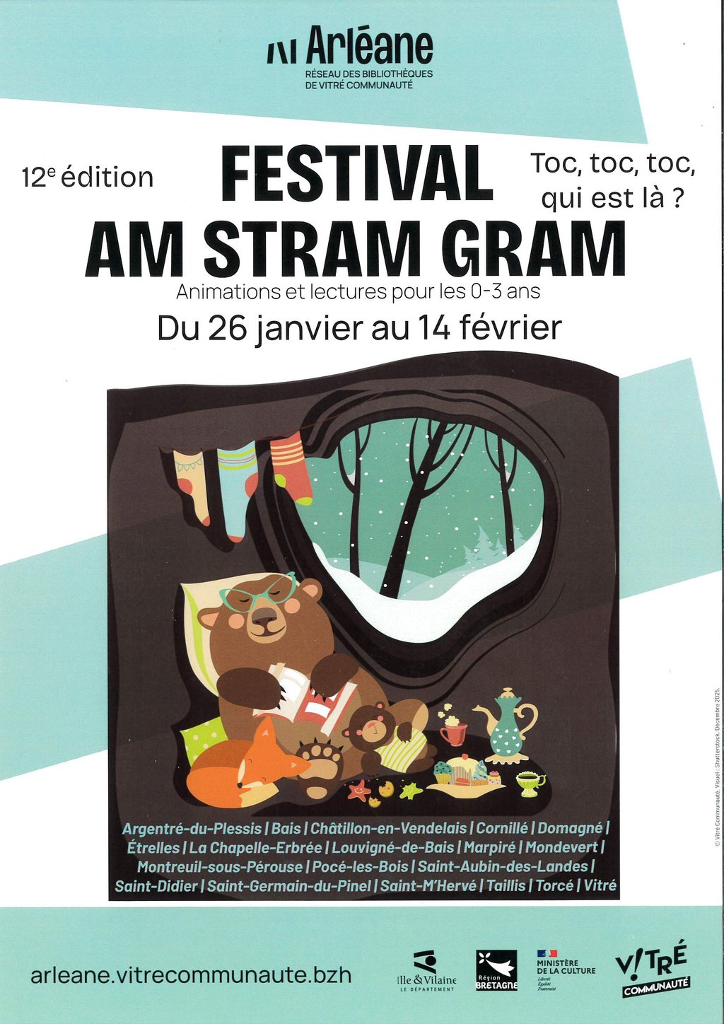 Arléane, le réseau des bibliothèques de Vitré Communauté, organise la 12ème édition du Festival AM STRAM GRAM "Toc, toc, toc, qui est là ?" du 26 janvier au 14 février 2026 (animations et lectures pour les 0-3 ans).