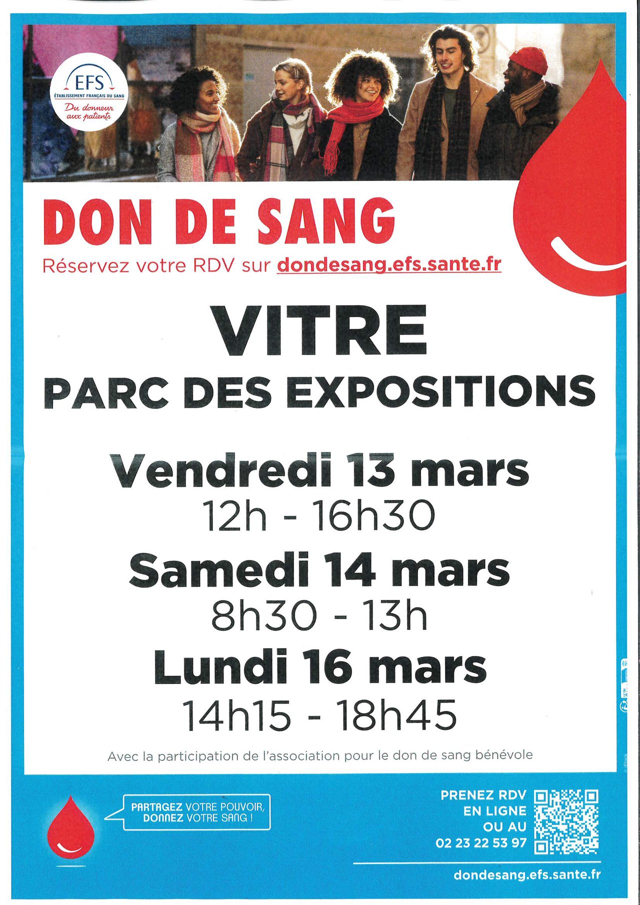 Don de sang à Vitré, Parc des Expositions du vendredi 13 mars au lundi 16 mars 2026.
