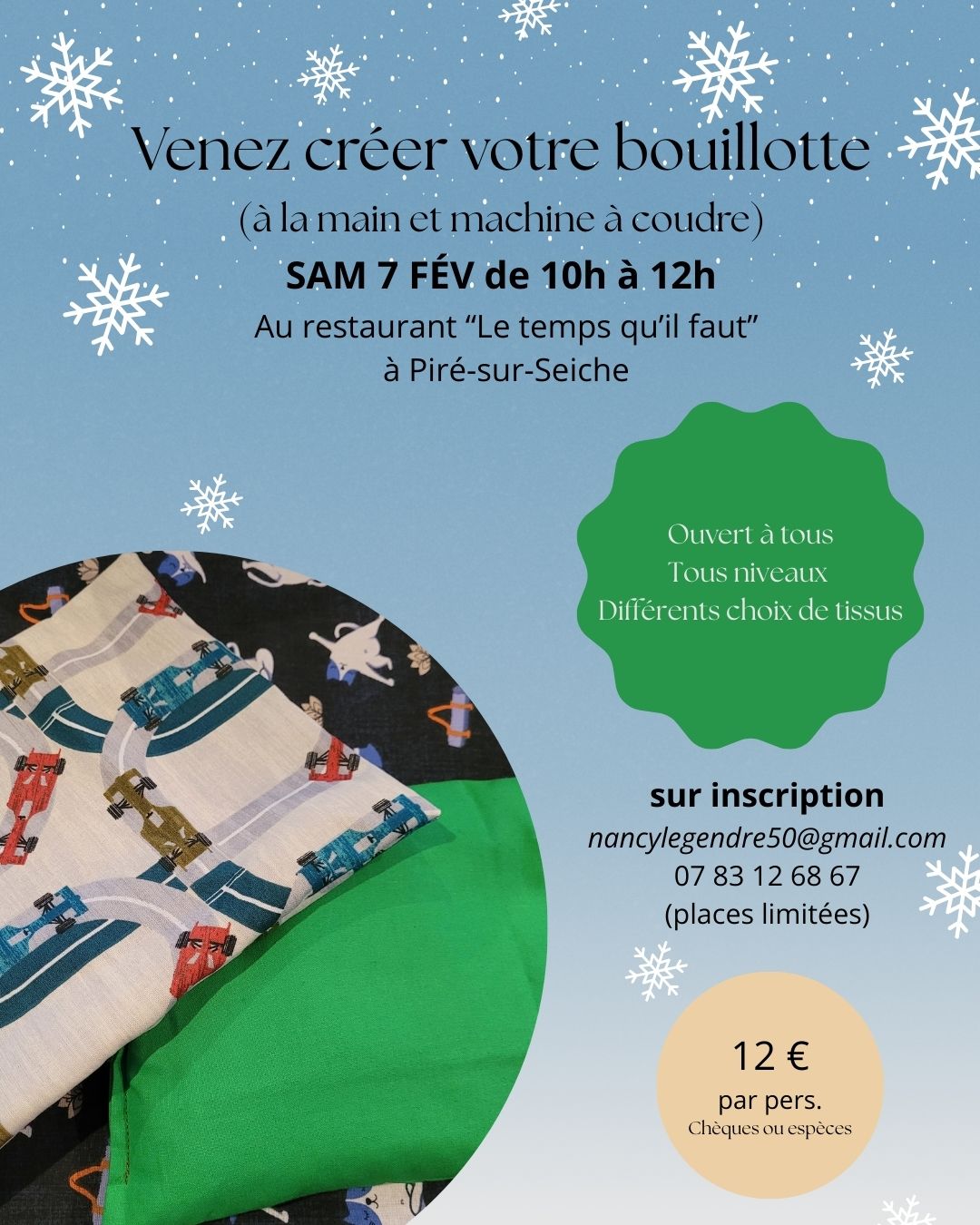 Samedi 7 Février à 10h : venez fabriquer une bouillotte faite maison. atelier animé par Nancy Legendre