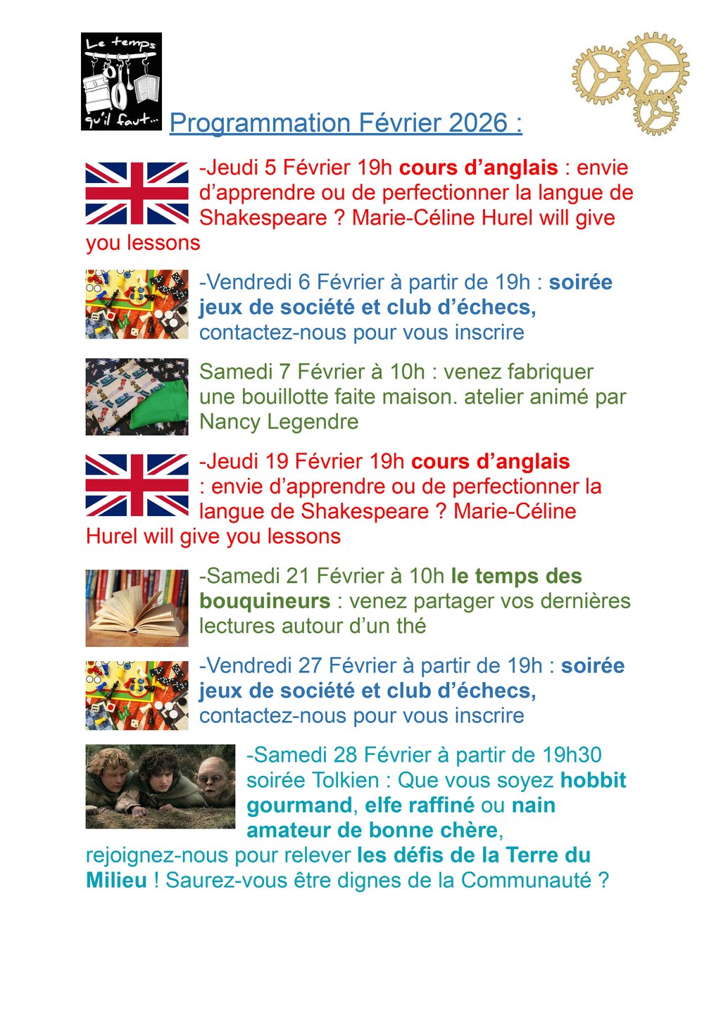 -Samedi 28 Février à partir de 19h30 soirée Tolkien : Que vous soyez hobbit gourmand, elfe raffiné ou nain amateur de bonne chère, rejoignez-nous pour relever les défis de la Terre du Milieu ! Saurez-vous être dignes de la Communauté ?
